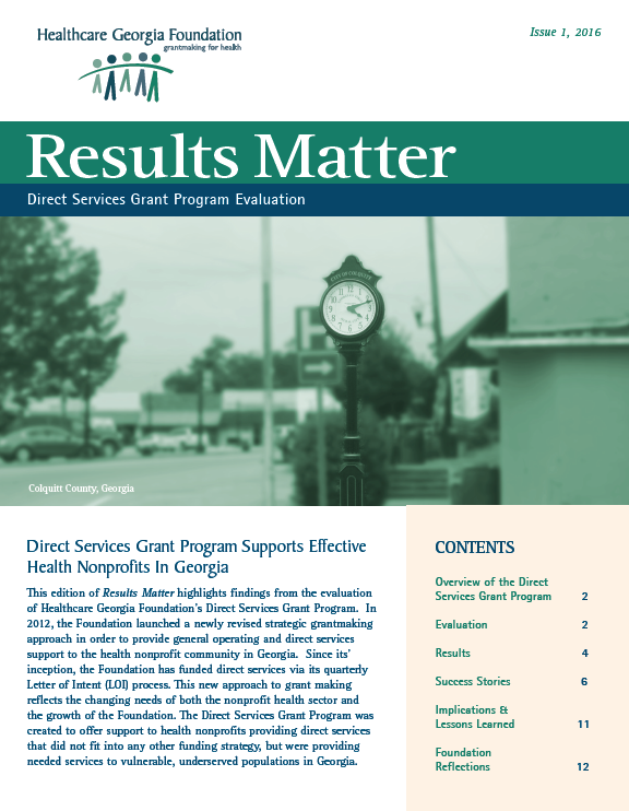 Results Matter: Findings From an Evaluation of Healthcare Georgia Foundation’s Direct Services Grant Program, Highland Nonprofit Consulting, LLC, Healthcare Georgia Foundation, Issue 1, February 2016, Publication #96.