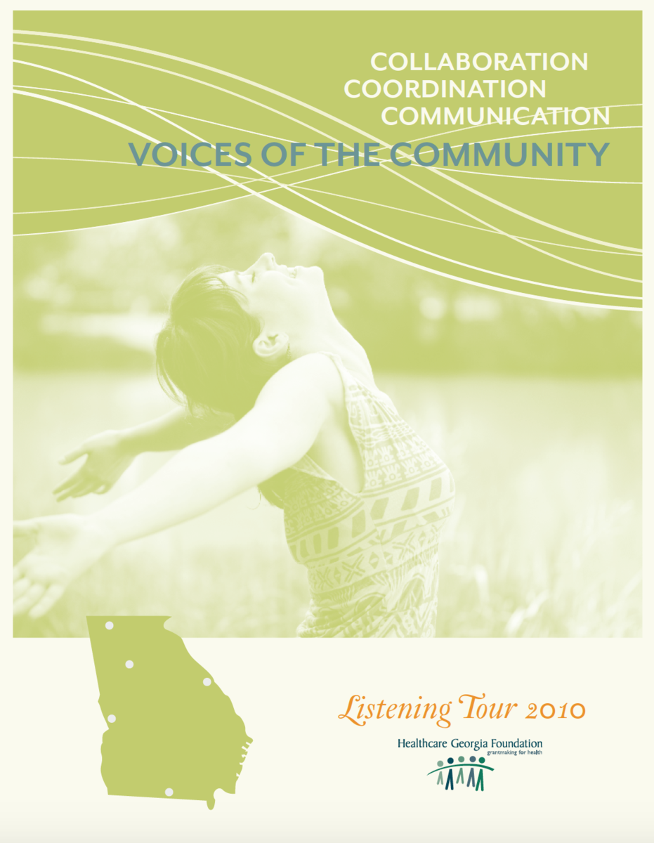In the summer of 2002, Healthcare Georgia Foundation conducted its initial Listening Tour, a series of ten region-based facilitated discussions with professionals working in public health, government, social services and the nonprofit sector. This publication chronicles the results of the Tour, including summaries for each tour city.