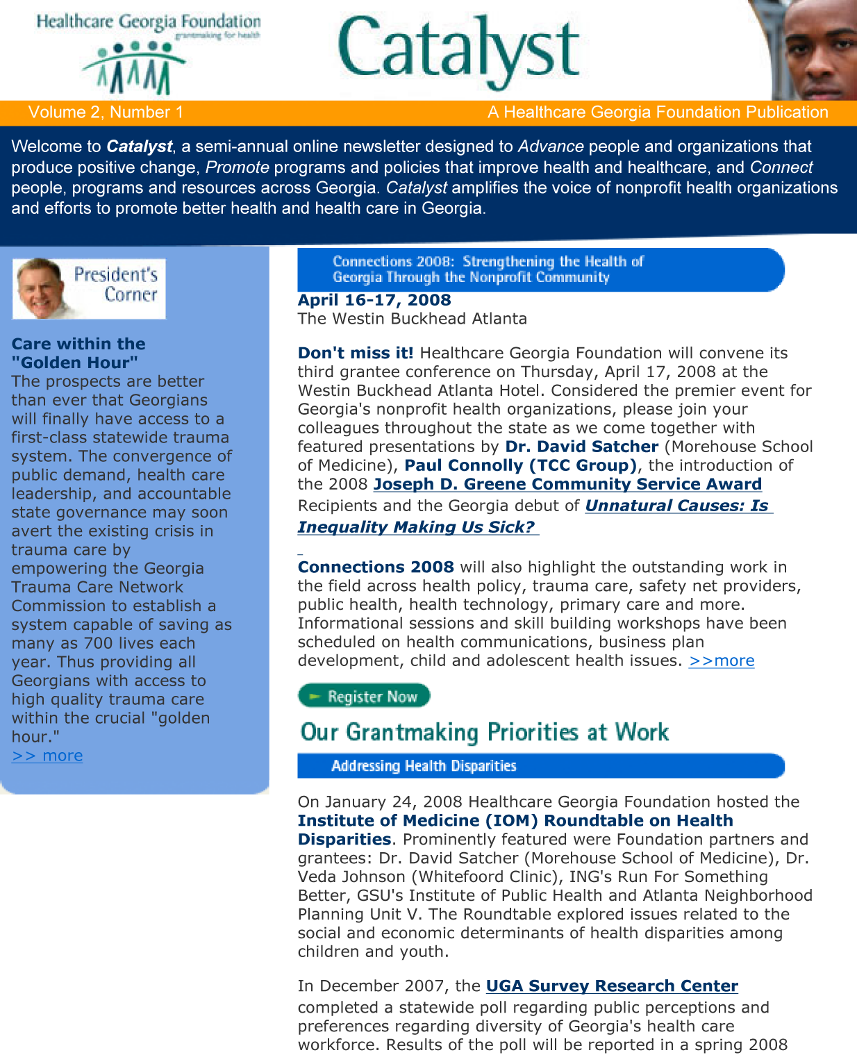 Catalyst is a semi-annual online newsletter designed to Advance people and organizations that produce positive change, Promote programs and policies that improve health and healthcare, and Connect people, programs and resources across Georgia. Features of this issue include Peachcare for Kids, Georgia’s Trauma Care System, and Organizational Assessments for Georgia’s Nonprofit Health Organizations.