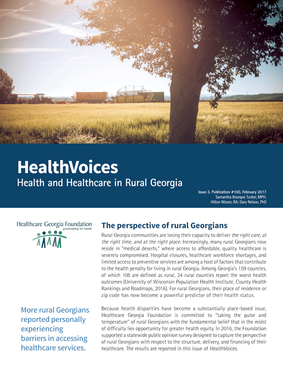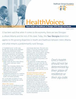 It has been said that when it comes to the economy, there are two Georgias: a vibrant Atlanta and the rest of the state. Today, this Two Georgias distinction applies to the growing disparities in health and healthcare between metro Atlanta and what remains a predominantly rural Georgia. Healthcare Georgia Foundation provided support in the winter of 2014 to conduct a public opinion survey among rural Georgians. This issue of HealthVoices reflects the survey’s findings regarding health and healthcare among more than 400 rural Georgians.