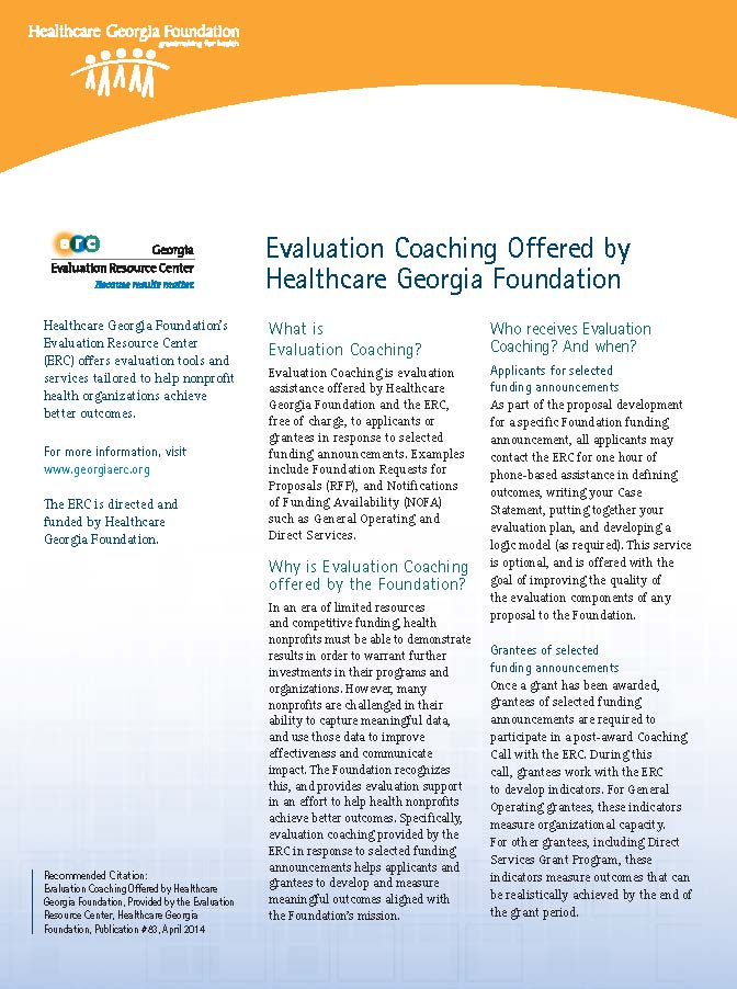 Evaluation Coaching Offered by Healthcare Georgia Foundation, Provided by the Evaluation Resource Center, Healthcare Georgia Foundation, Publication #83, April 2014