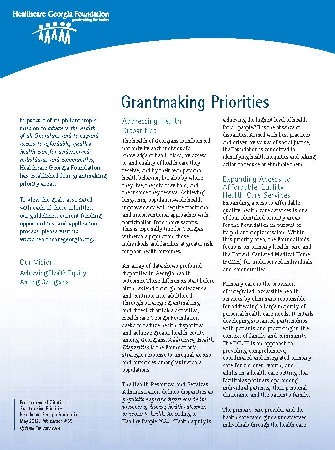 Healthcare Georgia Foundations and its grantees are committed to producing publications that address the complex health and health care needs of Georgians. The research, data and grantmaking within this listing of documents is grounded in science, built on strategic partnerships and focused on improving health outcomes.