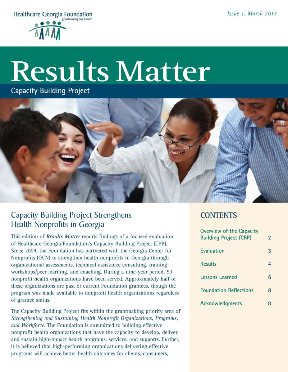Results Matter: Capacity Building Project, Community Evaluation Solutions, Healthcare Georgia Foundation, Issue 1, March 2014, Publication #82, 2014.