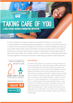 Healthcare Georgia Foundation’s Taking Care of You initiative is a multi-year funding effort by the Foundation to reduce preterm births, low-birth weight and SUID/SIDS among targeted high disparity populations in Georgia through the application of evidence-based interventions. This publication provides an overview of the initiative, which also constitutes the Foundation’s investment and contribution as a larger statewide effort to improve infant and maternal health outcomes in Georgia.