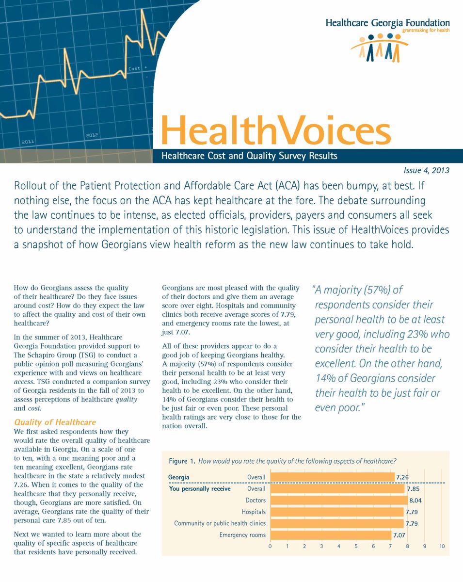 Rollout of the Patient Protection and Affordable Care Act (ACA) has been bumpy, at best. If nothing else, the focus on the ACA has kept healthcare at the fore. The debate surrounding the law continues to be intense, as elected officials, providers, payers and consumers all seek to understand the implementation of this historic legislation. This issue of HealthVoices provides a snapshot of how Georgians view health reform as the new law continues to take hold.