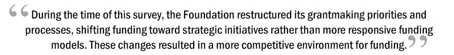 One tool that the Foundation uses to asses the effectiveness of its philanthropic activities is a survey of grant applicants. Surveys of grantees and applicants have been conducted in 2004, 2005, 2009, 2011, and 2015 to assess their experiences with the grantmaking process, Foundation roles, and the manner in which the Foundation engages its target populations of agencies and organizations.